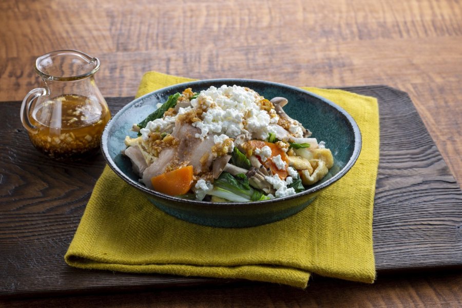 皿に盛り、カッテージチーズをのせ【香味ダレ】をかける。
