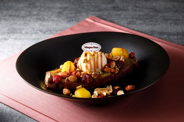 焼き芋の上に、ハーゲンダッツ ミニカップ バニラ→トレイルミックス→栗甘露煮の順に盛り付ける。