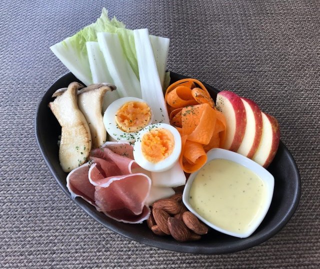 茨城県産の白菜をスティック状にカットし、にんじんやりんご、アーモンド等と一緒にドレッシングをディップしてお召しあがりいただくペイザンヌサラダです。