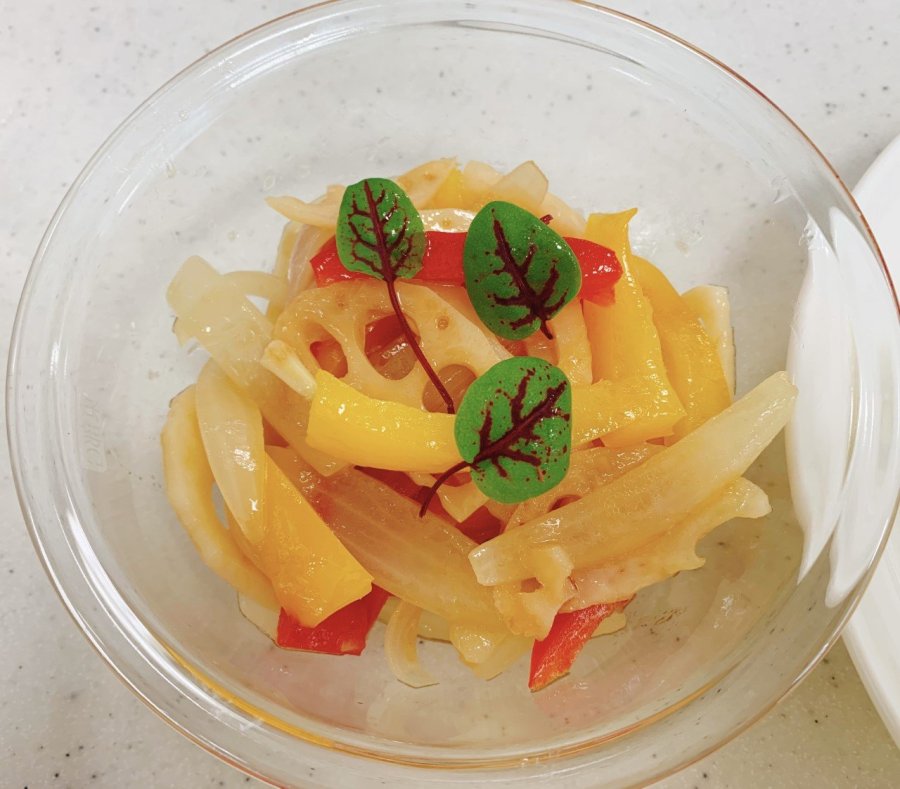 鍋、又はフライパンにニンニクオイルを大匙1入れ、弱火で蓮根、パプリカ、玉葱の順で野菜を炒めます。