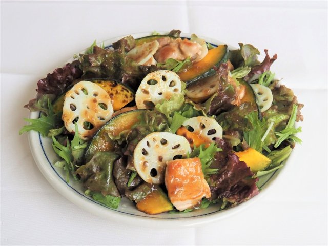 グリルしたチキンとれんこんが香ばしい、黒酢によく合う食材を使った、野菜がたっぷり食べられるサラダです。