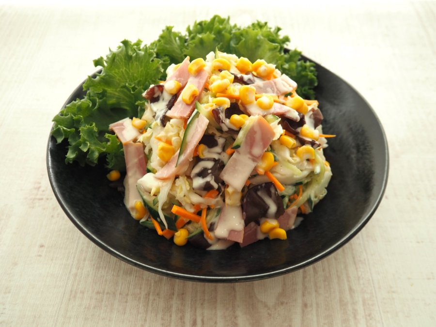 せん切りにした白菜はシャキシャキと歯ごたえがよく、他の食材になじみ、ドレッシングもしっかり絡んだコールスロー風サラダです。
