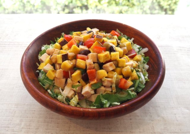 野菜も豆の食感もたのしめる、彩りもキレイなサラダです。チキンと一緒に食べることでタンパク質も摂れます。一品で1/3日分以上の野菜が摂れます。