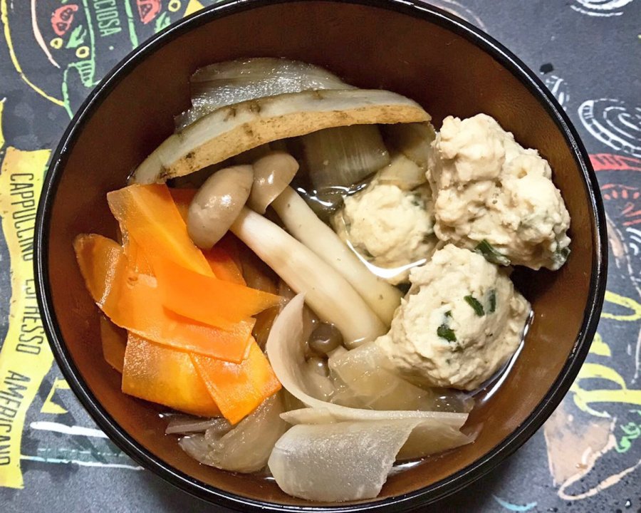 鶏団子に火が通ったら、ピーラーでスライスした1の野菜とねぎを入れ、一煮立ちしたら完成。
