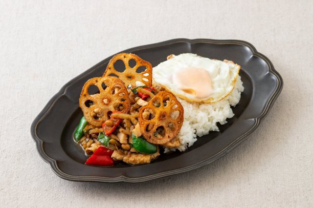 皿に温かいご飯を盛り、ガパオ、目玉焼きを盛り付け、れんこんチップを飾る。