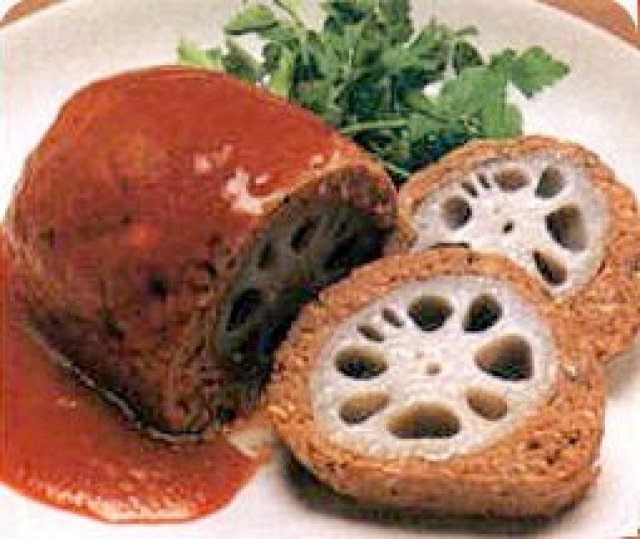 れんこんは皮をむき、スープでゆっくりゆでる。