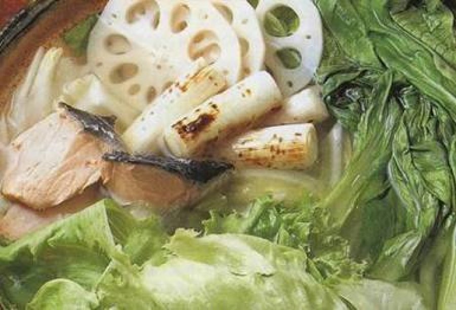 ねぎは4cmに切って網で焼く。れんこんは厚さ2mmの輪切り、ちんげん菜は縦4~6等分に切り、白菜は葉と茎にわけて葉はざく切り、茎はそぎ切りにする。