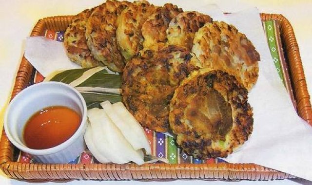 2に小麦粉を入れ、粗みじん切りにした野菜を入れ、えびを入れ、混ぜ合わす。(固さは、小麦粉、だし汁で調整する)