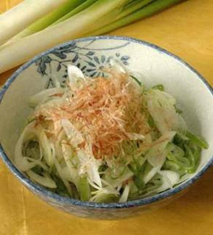 器にねぎを盛り、かつおぶしをふりかけ、しょうゆをかける。