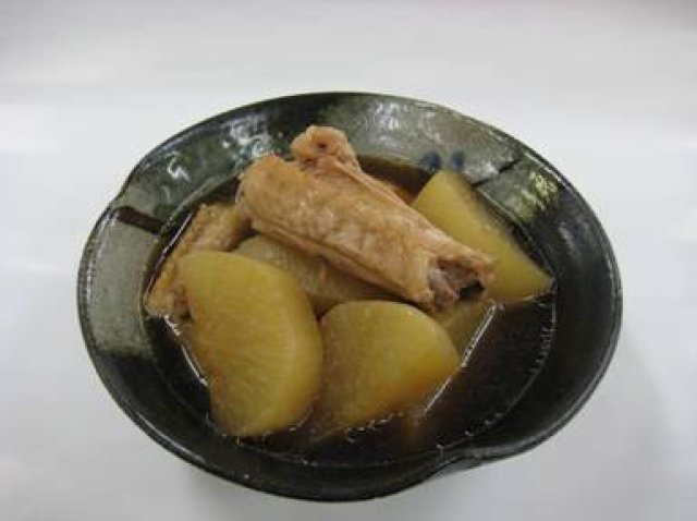 しょうが、だいこん、鶏肉をだし汁に入れ、強火で煮る。