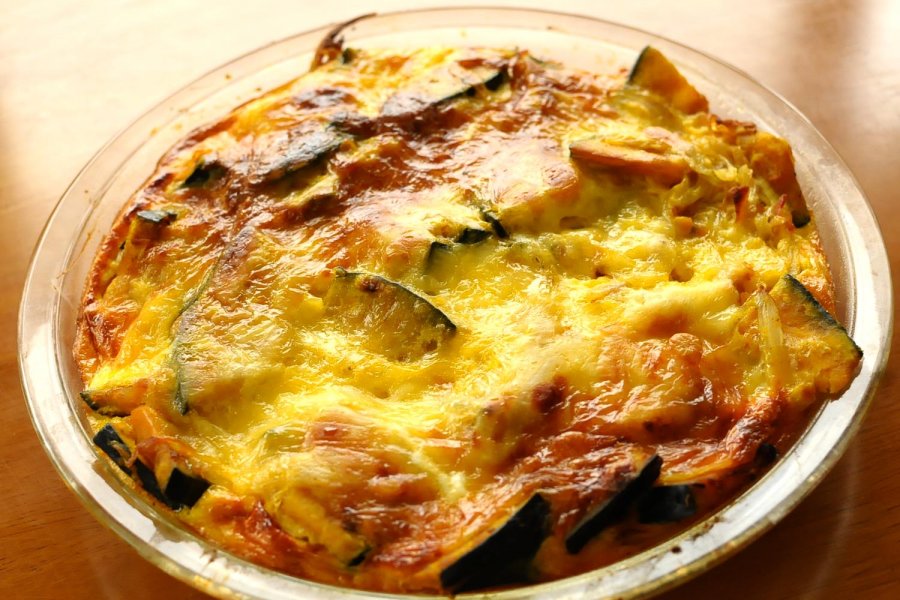 フライパンは油を入れて熱し、ベーコン、玉ねぎ、かぼちゃを入れて炒め、水大2をまわしかけて少しやわらかくし、塩、コショウで味をつけます。バターをぬった耐熱皿に入れます。