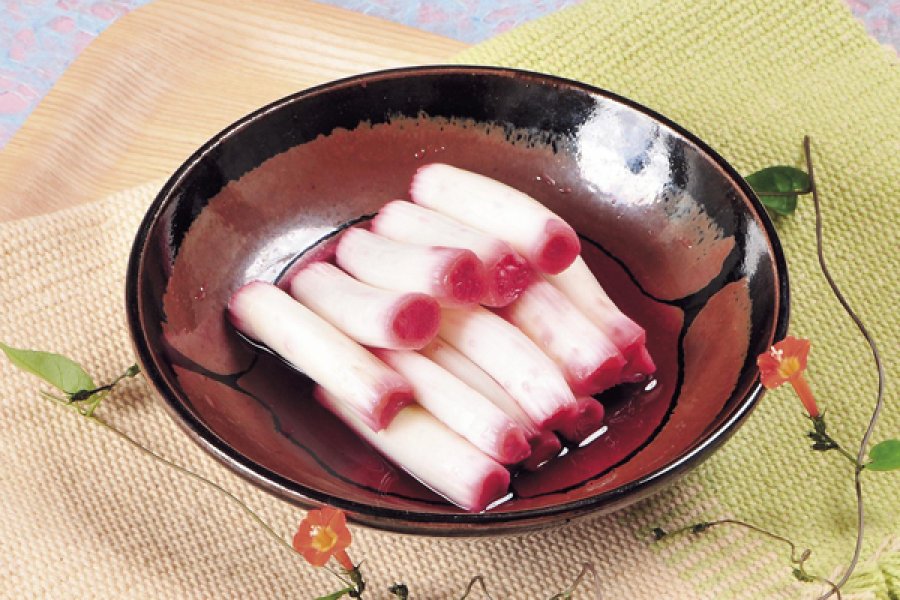 器にネギを並べ、上から赤梅酢をひたひたになるよう注ぎ入れ、ふたをして一晩おく。