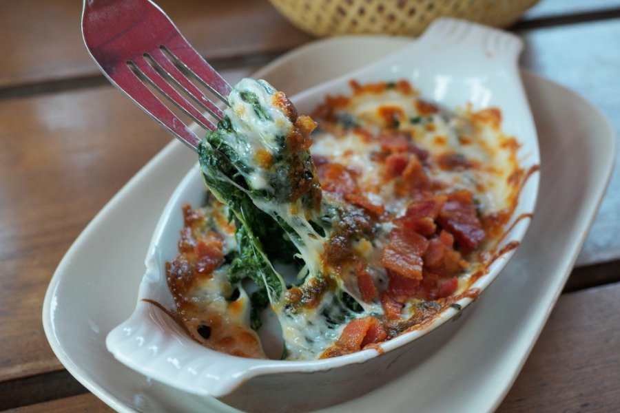 油を鍋に敷きほうれんそうとベーコンを炒める。塩と胡椒で味をととのえる。