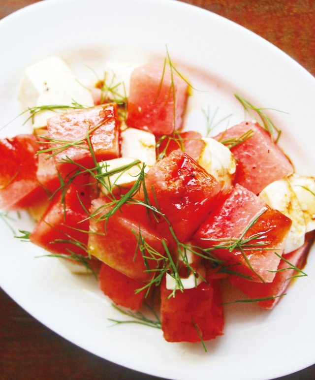甘いスイカと濃厚モッツァレラチーズの意外な組み合わせ。ワインのおつまみにもおすすめです。