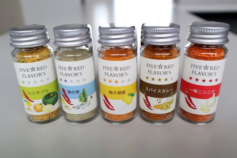 〇七福来ギフトBOX 「筑波八ツ房唐辛子」を使用した七味唐辛子のギフトボックスです。 「筑波八ツ房唐辛子」は、江戸時代の新宿で栽培されていた八房系の唐辛子の種を元に、筑波山麓で栽培している唐辛子です。これに、筑波山で古来から栽培されている「福来みかん」をはじめ、全て国産の原料をブレンドして製造しています。 〇FIVE☆RED FLAVOR’S 「筑波八ツ房唐辛子」に福来みかん等の国産原材料(一部輸入)を組み合わせて作った、味と辛さが異なる5種類のスパイスのセットです。「ベジタブル」「海の幸」「柚子胡椒」「スパイスカレー」「一味ニンニク」の順に辛さが強くなり、それぞれの辛さの度合は、パッケージに描かれた星の数で示されています。