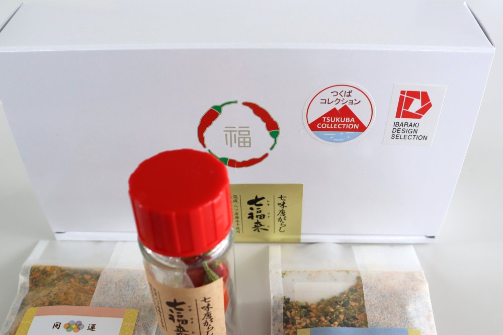 筑波山麓で栽培した「筑波八ツ房唐辛子」と「福来みかん」を使用した、筑波でしか作れない七味唐辛子です。筑波八ツ房唐辛子の特徴である辛さを活かし、福来みかんの香りを最大限に保つため、材料の加工方法にもこだわっています。 七味唐辛子と塩七味唐辛子に、筑波八ツ房唐辛子3本が入った小ビンがセットになっています。まずは小ビンの中の筑波八ツ房唐辛子をお料理に使い、空いたビンに七味唐辛子を入れて使用します。 商品のテーマは「開運」です。古来より唐辛子は魔よけとして使われてきました。外箱は「福」の字を3本の唐辛子が囲むデザインがあしらわれています。箱の中には運勢と食べ方の説明が書かれたおみくじが入っています。