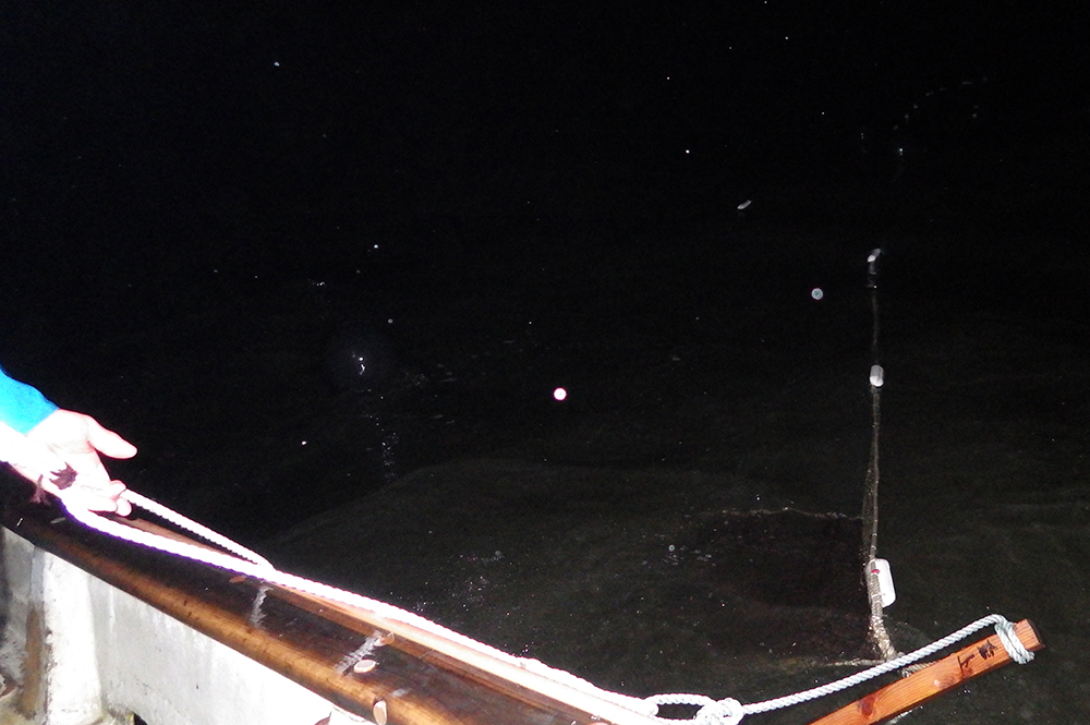 伊藤さんが当たりをつけた漁場に着くと、素早く網入れ(船から網を降ろす)が行われ、漁が始まります。時速4キロメートル前後でゆっくりと船を進ませながら、水中の袋網を広げていきます。