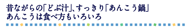 郷土料理の「どぶ汁」は、元々漁師が船上で食べていたもの。水の貴重な船上で、水分の 多い魚であるあんこうが用いられたといいます。お店では鮮度の良い肝を乾煎りした味噌仕立ての味付け、そこへあんこうの七つ道具や 地元の野菜をたっぷり入れます。地域によってはワカメや切干し大根を入れるところもあり、あんこうも野菜も鮮度の良いものを食べる ことが最も贅沢。