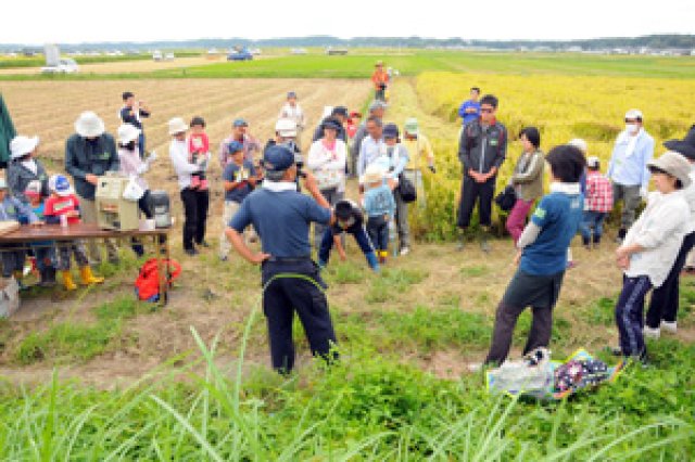 丸エビ倶楽部では、生活クラブと共同で、「主食である"米"の生産実態を通じ、米作りの大変さや楽しさを知り、田んぼや農地を残すことの意味の重要性を考える」ことを目的として、生活クラブの組合員向けに田んぼの作業体験を行っており、2014年度で15回目を迎えました。 年3回のすべてに参加した参加者には、丸エビ倶楽部の新鮮な野菜セットをプレゼント。じゃんけん大会や、丸エビ倶楽部の婦人部の方たちが用意した羽釜で炊いたご飯と、おみそ汁、おかずを昼食として、田んぼで食べる時間もあります。参加者が終始笑顔だったのが印象的でした。 この体験会で、丸エビ倶楽部の生産者は消費者との交流を図っています。