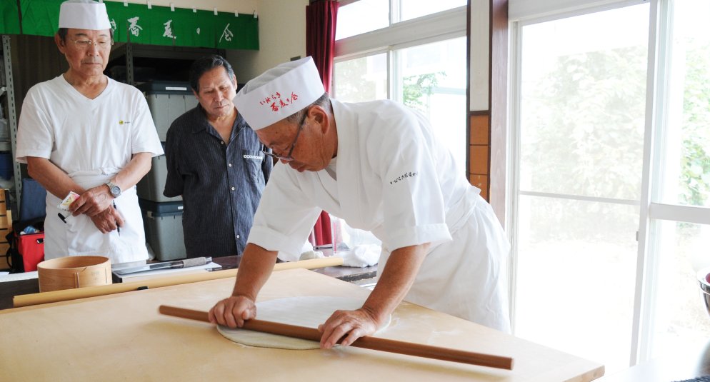 育てる、挽く、打つ、そばの全てが大好きだという宮本さん。なかでも、“打つ”ことに関しては、友人の紹介で知り合った、観光庁が選定する「観光カリスマ百選」にも選ばれている『唐橋 宏さん』の元に毎月通い、そばづくりの知識・技能・経験を学んだそうです。 宮本さん「そば打ちは、元々あゆ釣りの仲間達と一緒に始めましたが、そこからどんどんのめり込んでいきました。唐橋さんの所にはただ技術を学ぶだけじゃなく、“教え方”も知りたくて通いました。そば打ちを教える時、『こうやってください』と言うよりも、“なぜそうするか”というロジックを伝えると、よりわかりやすいと思ったからです。また、唐橋さんの所には全国からそば打ちを学びたいという人達が集まってくるので、県外の人達との繋がりができたのも良かったですね。」 宮本さんが副幹事長を務める『いばらき蕎麦の会』では年に10回ほどそば打ちの指導を行うそうです。更に宮本さんは、水戸農業高校『蕎麦打ち部』の指導を務め、全国そば打ち選手権大会出場へ導くなど、そば作りだけでなく、そばの普及活動も積極的におこなっています。