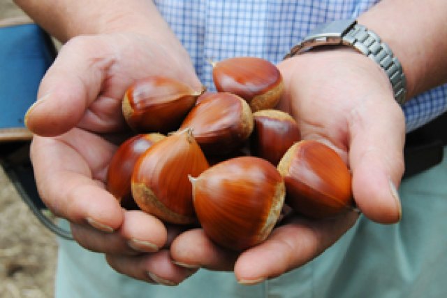 茨城県は作付面積・出荷量とも全国第一位を誇る栗の生産地。なかでも笠間市は作付面積が県内で最も多く、市内のいたる所に栗畑が広がります。 小澤栗園は、およそ50年ほど前から続く栗園で、笠間市で「小澤栗園」といえば知らない人はいないほど。三代目となるご主人・小澤一男さんが作る栗はもとより、独自の技術で作る「焼き栗」が美味しいと評判です。 小澤さんが栗を生産する上で最も心掛けていることは『見た目が良い栗よりも、味の良い栗を作る』こと。「大きくて、見た目がつやつやしている栗でも、食べてみて美味しくなければダメ。とくに栗の味は、日照と風通しで変わります。」小澤さんの栗園は、化学合成肥料を使用しない土づくりと、栗の葉、イガにまで十分日光が当たるように、木と木の間隔を通常より1mほど広く空ける栽培法に取り組んでいます。木の数が少ないということは必然的に収穫量が落ちるということ。しかし、小澤さんはあくまでも「量より味」を目指しているのだそうです。さらに、収穫後の栗は最低でも1週間、低温で貯蔵し、糖度をぐっと上げています。