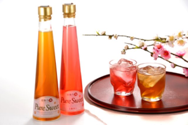 『常陸乃梅』完成と共に、大山さんは『常陸の梅プロジェクト』を発足。いよいよ夢だった『常陸乃梅』を使った加工商品の開発に乗り出します。 「今までは観るだけでした。でもこれからは…茨城県産の梅が食べられる!」のコンセプトのもと、第一弾商品として開発された『梅シロップPureSweet』は、緑とピンクの二種類あります。緑の箱は常陸乃梅の青梅を使ったシロップ、ピンクの箱は"露茜"を使ったシロップです。 「梅を漬け込むとき、常陸乃梅の青梅には国産三温糖を使い、"露茜"は砂糖のみで漬け込みを行います。」常陸乃梅のシロップは黄金色に輝き、"露茜"を使ったシロップは美しいピンク色です。エグみが一切なく、梅のおいしいエキスだけがギュっと絞られたようなこのシロップは、甘味料、保存料、香料は一切使用していない無添加のシロップです。