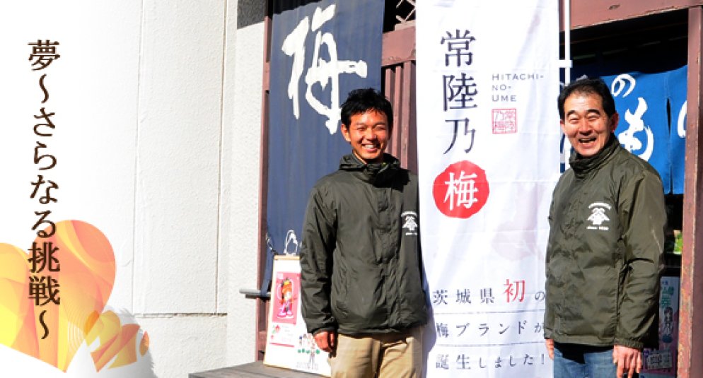 大山さんはさっそく、かすみがうら市のJA土浦千代田梅部会に梅ブランド開発の話を持ちかけました。 「運がいいことに、千代田梅部会の皆さんはちょうど農研機構果樹研究所が開発した、梅とスモモを交配させた新しい品種『露茜』(つゆあかね)をたくさん育てているのに商品化できなくて困っていました。」 大山さんは、梅加工のプロである吉田屋が『露茜』の加工・販売を請け負うことを約束し、その代わりに茨城の梅ブランド開発への協力をお願いしました。 しかし、梅をブランド化するということは、今まで以上に手間をかけて梅を育ててもらわなければなりません。そこで大山さんは、生産者に意欲的に取り組んでいただく為に、ある提案をしたそうです。 「まず、市場の規格に合わないB級品の梅は吉田屋で買い取ることで、今まで以上の利益を提供することを約束しました。次に、毎年変動する梅の買取金額を一律にして、生産者に安心感を持ってもらいました。」こうして生産者と大山さんは一体となって『茨城県の梅ブランド』にふさわしい梅の育成と、加工技術の研究にも努めました。 そして2013年2月、ついに『常陸乃梅』という茨城県産梅ブランドが誕生しました。また、この事業は、生産は千代田梅部会の皆さんが、商品化と販売は大山さんが行うという形で、農商工等連携事業計画から正式に認定を受けました。