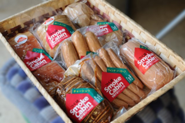 学園手造りハムの会の製品は、輸入冷凍肉を使わず、新鮮な生肉(茨城の銘柄豚ローズポーク)を使います。こだわりの原材料を元に、製造方法にもこだわり抜くのが『学園手造りハムの会』流。 直江さん「まずハム用、ソーセージ用、ベーコン用に仕分けた豚肉を、塩と砂糖に2~3週間にわたって漬け、十分熟成させます。塩漬けの時、細菌の抑制に"硝素"だけはどうしても必要なのですが、他の防腐剤、保存料は一切使用せず、異種蛋白による増量もしていません。漬けこみが終わると、ハムを未ざらしの木綿布でしっかり巻いて形を整え、ソーセージは天然の羊腸・豚腸につめます。この丁寧な手造り手法は日本では珍しいものです。」 最後に桜の薪を使い、約2~5時間(商品によって変わる)かけて低温でじっくりスモークして完成となります。ブランド名“スモークギャビン”の名の通り、香り高い『学園手造りハムの会』製品の秘訣はここにあります。