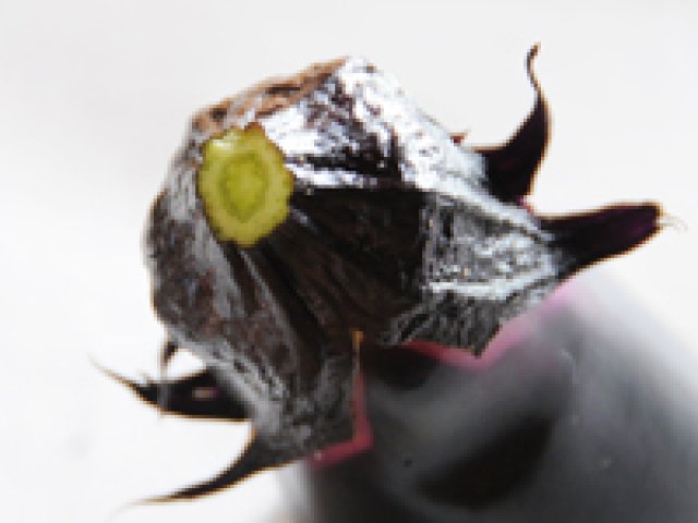奥久慈なすは、一個85グラム~90グラム程度の小ぶりなものが一番おいしいとされています。皮は薄く柔らかで、中身は火を通すと口の中でとろけそうなほど。梶山さんにおいしいなすの選び方を教えていただきました。 「鮮度の良いなすを選ぶには、ヘタの先の切り口を見てください。切り口が緑色に近く、ひからびていない方がより新鮮です。」
