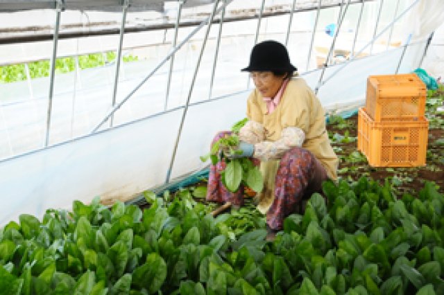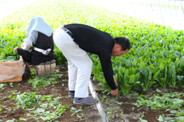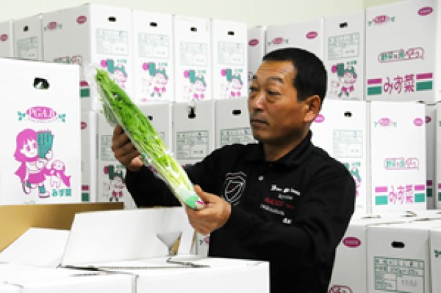 戦後からハウス栽培が盛んな鉾田市。鉾田舟木地区で、PGA.Bグループ(ピュアグリーンアグリ・ベーシック)代表を務める木村貴浩さんは、もともとメロンを作っていました。 毎年売上げ金額の目標を設定しそれをクリアして行くことで、良いものを作る楽しさ、売れる喜びを実感していたそうです。 しかし、大きな目標であった年間売上げ5千万円という金額をクリアした時、次の目標をどこに置くべきか考えたそうです。 「その当時私には2つの選択肢がありました。この売上げを多少前後しながらもキープしていくか、更にもっと上を目指すか。私の性格上、迷わず後者を選びました。しかし、もっと高い目標を目指すには、メロン作りではこれが限界だと感じたのです。」 木村さんは悩んだ末、メロンを作っていたハウスで、当時、国内において需要量が急増していたみず菜を作り始めました。ハウスを増やし、仲間を増やし、現在では9haもの広大な土地で、みず菜、ほうれんそう、小松菜、空心菜を栽培し、県内でも有数のハウス栽培農家へと躍進していきました。