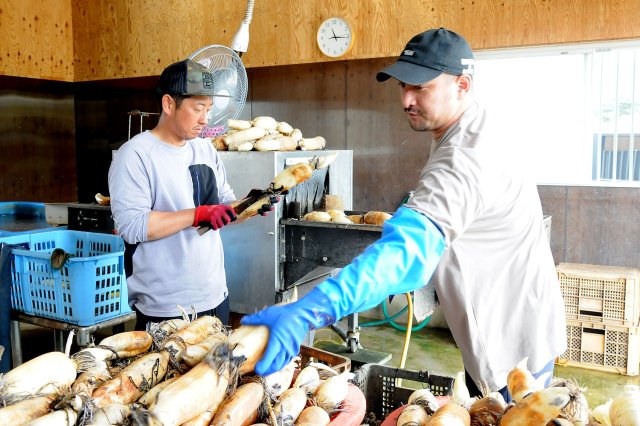 2人の作ったれんこんが初出荷となった2018年8月。地元農協ではれんこんの取り扱いが無いため、師匠の紹介で茨城県南地域を管轄する全農に出荷できることになりました。 小原さん 「『できない』と言われていましたが、できたんです。確かに茶色い赤渋(アカシブ)がついているのですが、収穫前に葉を折って光合成を止めたり、収穫後少し置いておくことで白くなる。産地じゃないので、地元の人はその情報を知らなかったのかもしれないですね」 初出荷にも関わらず予想以上の高値がついたとのことで、これならばやっていけると確信し、一年を通して切らさずに出荷する通年出荷も実現しました。 2022年には2人で「JAなめがたしおさい れんこん部会」を設立し、目揃え会(出荷前に色や形、見た目などの出荷規格を確認する会)も定期的に開催。 2023年現在はそれぞれにスタッフを抱え、小原さん約11ha、出頭さん約7haの蓮田で鹿嶋産れんこんの生産を行っています。 「まだまだ納得のいくれんこんは作れていない」と語る2人ですが、地元の方たちにれんこんを食べてもらうと、「甘い」「みずみずしい」「もう他のれんこんは食べられない」など2人のれんこんを絶賛する声が多く届いているそうです。