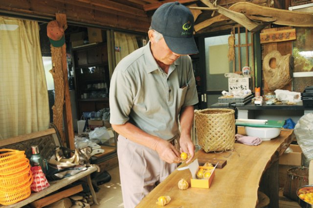 茨城県の北東部に位置する高萩市は、海、山、川に囲まれた自然豊かな地域です。北に関根川、南に花貫川という2つの川が流れており、花貫渓谷は、紅葉スポットとしても人気です。花貫渓谷のほど近く、山間部にある大能(おおのう)地区に、フルーツほおずきの栽培・加工販売を行う「花貫フルーツほおずき倶楽部」があります。花貫フルーツほおずきの旬は8月中旬~10月下旬。とても繊細な作物で、夏の暑さに弱い為、夏も冷涼な大能地域は、ほおずきの栽培にとって絶好の立地条件です。加えて、畑の周辺には川が流れている為、湿った環境を好むほおずきには最適な環境がそろっています。 果実の大きさはミニトマトほど。フルーティーな香りと、甘酸っぱい味が人気です。和紙のような萼(がく)を剥いて生で食べるのはもちろん、県内外のホテルや洋菓子店などで、ほおずきの芳醇な風味を活かしたスイーツや食材として使われるなど、料理人からも注目を集めています。 蓬田茂さんが「花貫フルーツほおずき」の栽培を始めたのは、平成19年のこと。当時、会社員で定年を間近に控えていた蓬田さんは、花貫渓谷のほど近く「花貫物産センター」の裏手に、趣味であった木材加工の工房を建て、畑にほおずきの苗を植えました。 「花貫物産センターでは、自分で作った木工細工を持ち込んで販売していました。ある日、お客さんから『ここには何度来ても同じものしかないね。』と言われ、悔しくなりました。『今に見てろよ、俺がほおずきで何とかしてやる』という気持ちが湧きあがりました。」それが、蓬田さんがほおずきを本格的に作り始めたきっかけだったそうです。