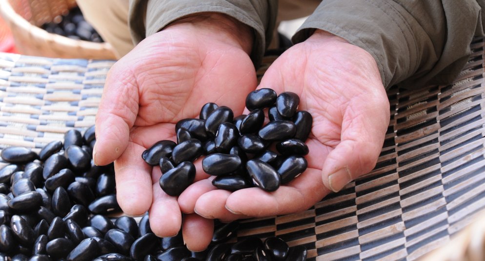 平成14年に茨城県オリジナルの花豆(ベニバナインゲン)として、品種登録されたのが「常陸大黒」です。常陸大黒は、花豆の中でも国内初の黒単色で、1粒約2グラムもあり、“日本一大きな花豆”と言われています。 常陸大黒は、上品な味わいをもち、和菓子だけでなく洋菓子にもよく合うため、パティシエなどからも高い評価を受けています。 今回は、常陸大黒生産部会の部会長を務め、大子町で長年常陸大黒を作り続けている鈴木澄男さんと、フードアルチザンの取り組みとして常陸大黒を取り扱っている、イオンリテール株式会社の原忠さんと森英明さんにお話しをお伺いしました。
