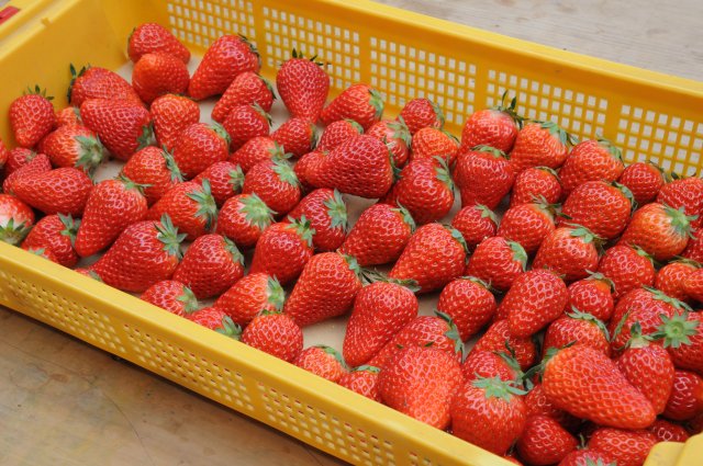 つくば市にある「つくばねファーム」は、筑波山のすそ野にかまえた1000坪のビニールハウスが目印の、「摘みたていちごの直売」と「いちご狩り」が人気のいちご園です。品種は、「紅ほっぺ」を主力に、「いばらキッス」、「恋みのり」、「おいCベリー」等4種類を生産しています。 つくばねファームのいちご(紅ほっぺ)は、第7回茨城いちごグランプリ(※)一般の部で「大賞」を受賞しているほど、その味はお墨付き。受賞について代表の小辻さんは、「光栄ですし、ありがたいです。チームで栽培にあたっているので、直売所に表彰状を飾らせてもらって、スタッフ一同士気が上がっています」とコメントしてくれました。 ※茨城いちごグランプリ…茨城県いちご経営研究会主催の年に1度の審査会。茨城県内各地のいちご生産者が栽培したいちご、栽培現場、管理方法を対象に審査が行われ、生産技術の腕を競い合う。