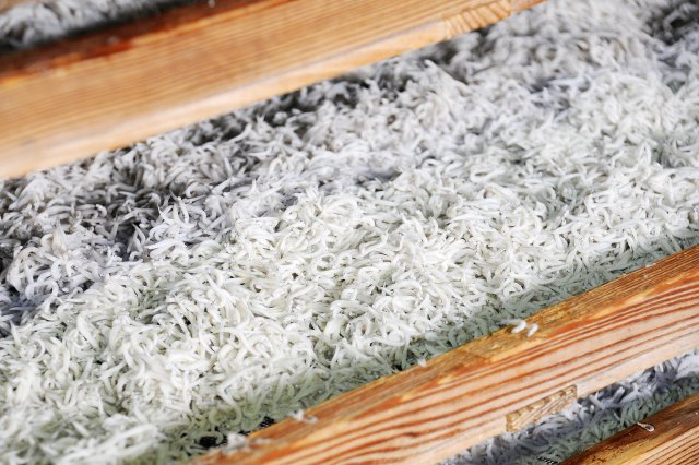 安重水産の敷地に入ると、一面にしらすの干し場が広がります。海風と太陽で干しあげる「天日干し」は、安重さんのこだわるところ。「天日干しをすると色ツヤも、味もよくなるんだよ」と安重さん。 鹿島の海と風土と職人の技がつくり上げる安重水産のしらすは、艶やかな色と綺麗に揃った形で、まるで芸術品のような仕上がりです。茹でたての釜揚げしらすをひとくちいただくと、爽やかな磯の香りがして、ふわふわながらしっかりとした食感があり、塩加減が絶妙で、絶品でした。 「今日はちりめんを作るから、ここから約5時間くらい天日干しにします」と安重さん。その間も続々と「安重水産のしらす」を買い求めに、地元の人達が訪れていました。