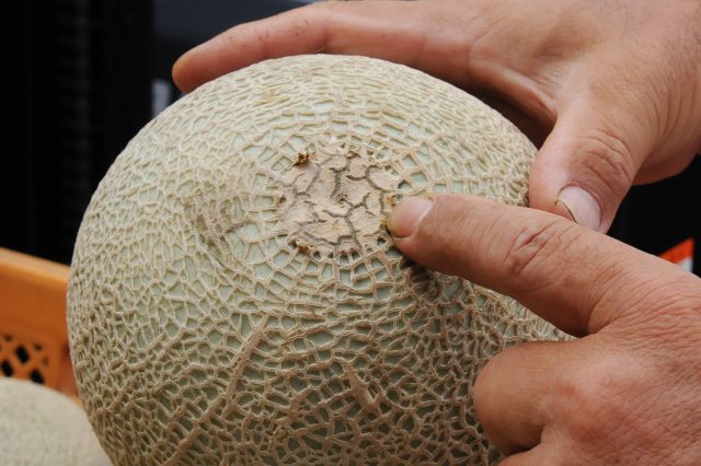 メロンは実を売る商売。良い実を育てるには、何より、“良い葉”を作ることが大事なのだそうです。 「葉と実の良さはだいたい比例してきますから。丈夫な樹が大根のようにしっかりとした根を張らせ、サトイモのように立派で大きな葉を付けることができれば、十中八九良いメロンになります。」その、“大きな葉”を作るには、たい肥と有機質肥料の分解速度を考え、与える時期とタイミングが大切なのだそうです。 また、もうひとつの長洲さんのこだわりが、収穫時期。 「葉の先がカリカリになってくると、メロンが熟し始めた証。それから4~5日収穫を我慢すると、今度は葉がチリチリになってきます。そこでメロンのお尻を見ます。おしりが少しヒビ割れて、実がパンパンになったところでやっと収穫します。メロンは収穫後、置けば果肉が追熟し柔らかくなります。しかし糖度は収穫してしまったらそれ以上は上がらない。柔らかくなると人間の舌の感覚で甘くなったように感じるのですが、実際糖度は収穫した時に止まってしまうんです。やっぱり甘いメロンを食べて欲しいですからね。限界まで糖度を上げることにこだわっています。」