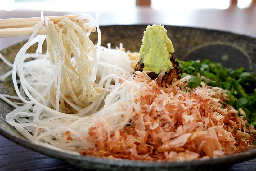 【ぶっかけせいろ】おそばの上に、大根の千切り・鰹節・青ねぎ・揚げたそばの実など豊富な薬味があしらわれており、その風味をお楽しみください。トッピングの焼みそが食感のアクセントに。