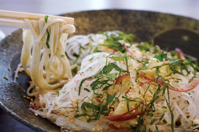 【すずしろせいろ】おそばの上に、大根の千切りを盛り、大葉・みょうが・白ごまをきれいにあしらっております。夏におすすめのさっぱりとした商品です。