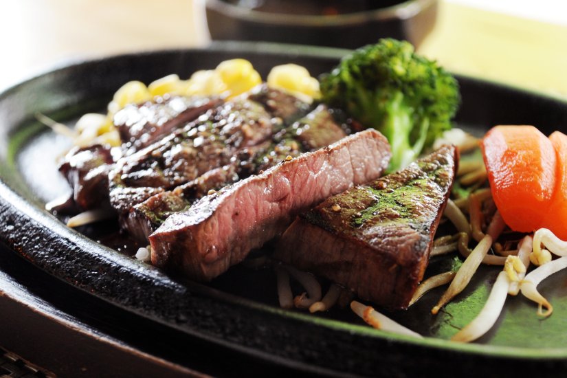 茨城県銘柄牛「常陸牛」のランプステーキは、柔らかな食感で赤身のうまみが際立つ逸品。まずはそのまま肉のうまみを楽しみ、そのあとわさび醤油のオリジナルソースでいただくのがおすすめです。