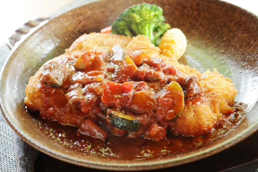 茨城県銘柄豚肉「常陸の輝き」のポークカツレツは、「常陸の輝き」200gを厚切りにしたボリューム満点のひと品。脂の甘みと肉質の柔らかい常陸の輝きのうまみを野菜たっぷりのトマトソースが引き立てます。