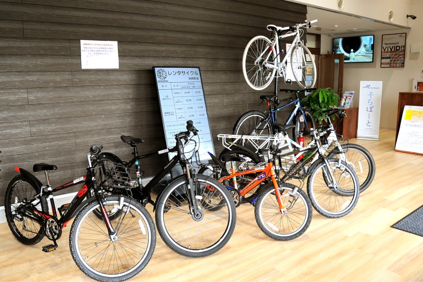 1階の「農産物直売所」では、地元や周辺地域の新鮮な野菜や総菜、ケーキなどの加工品をはじめ、米どころである河内町のおいしいお米などを取り揃えています。また1階は、電動アシストサイクル、スポーツサイクル、キッズバイク等12台のレンタサイクルが揃い、シャワー室も備えた「サイクルステーション」と、成田空港相談窓口「NAAコミュニティラウンジそらぽーと」があります。