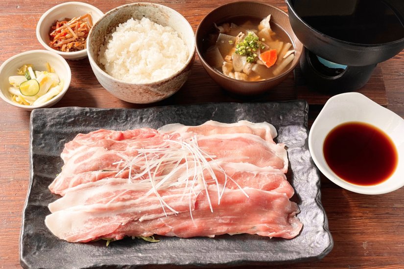 一番人気の「しゃぶしゃぶ御膳」は、じごいもの豚のおいしさとうまみを最大限に感じられるメニューです。“御膳”とつくメニューにはセットでごはん、手作りの具だくさん豚汁、小鉢にお新香が付きます。