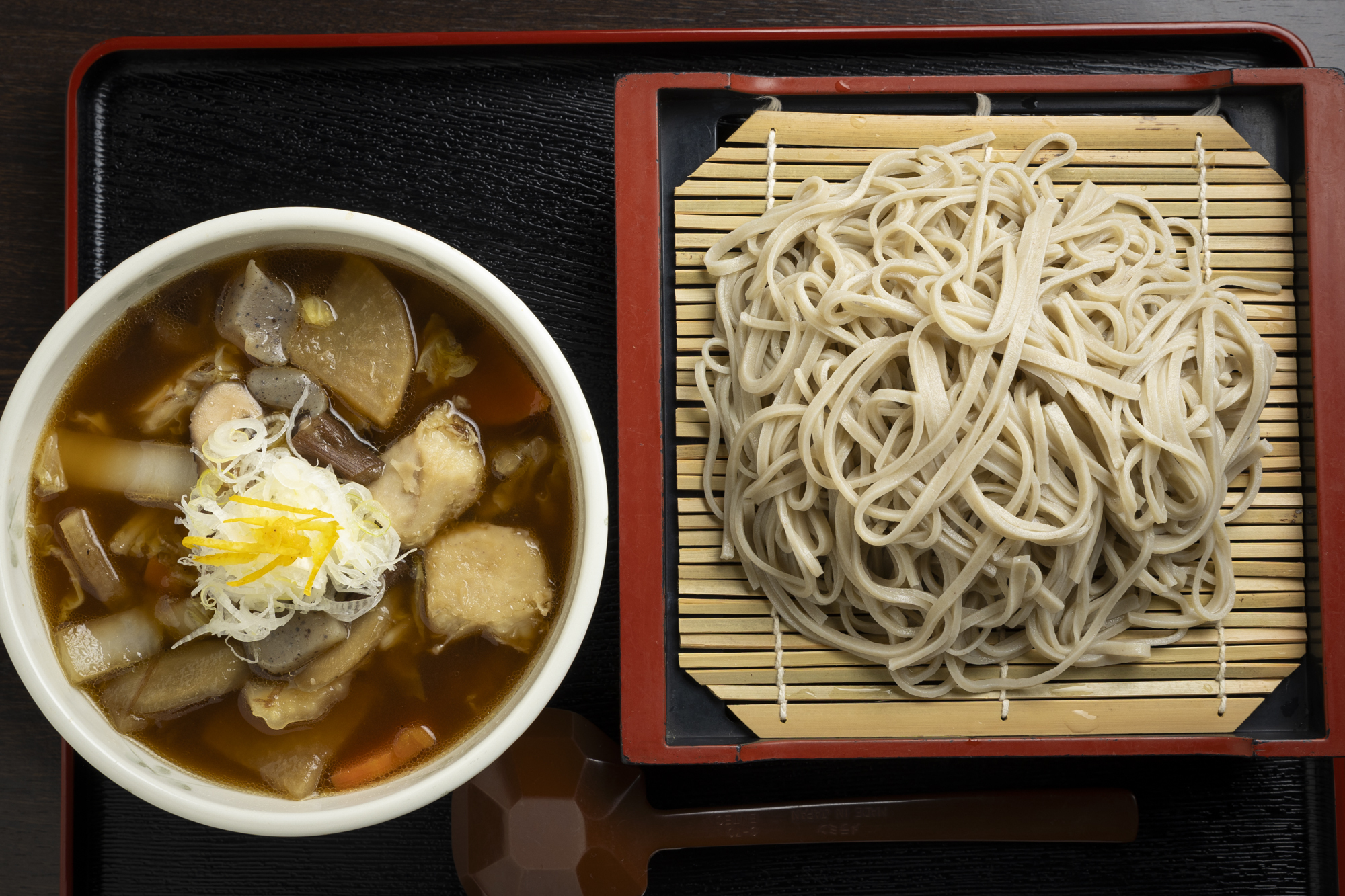 そしてもう一つは、常陸秋そばの故郷で味わう地元の味「つけけんちん蕎麦」、茹で前で160gのボリュームで食べ応えも十分です。このけんちん蕎麦は、常陸太田と言えば「つけけんちん」と言われるほどのソールフード。白菜、里芋、人参、ごほうなどの野菜を炒めながら味噌を絡め、醤油ベースのちょっと濃い目の味に仕上げる田舎仕立てがたまらない美味しさ。芋がらは決して忘れてはいけない食材です。