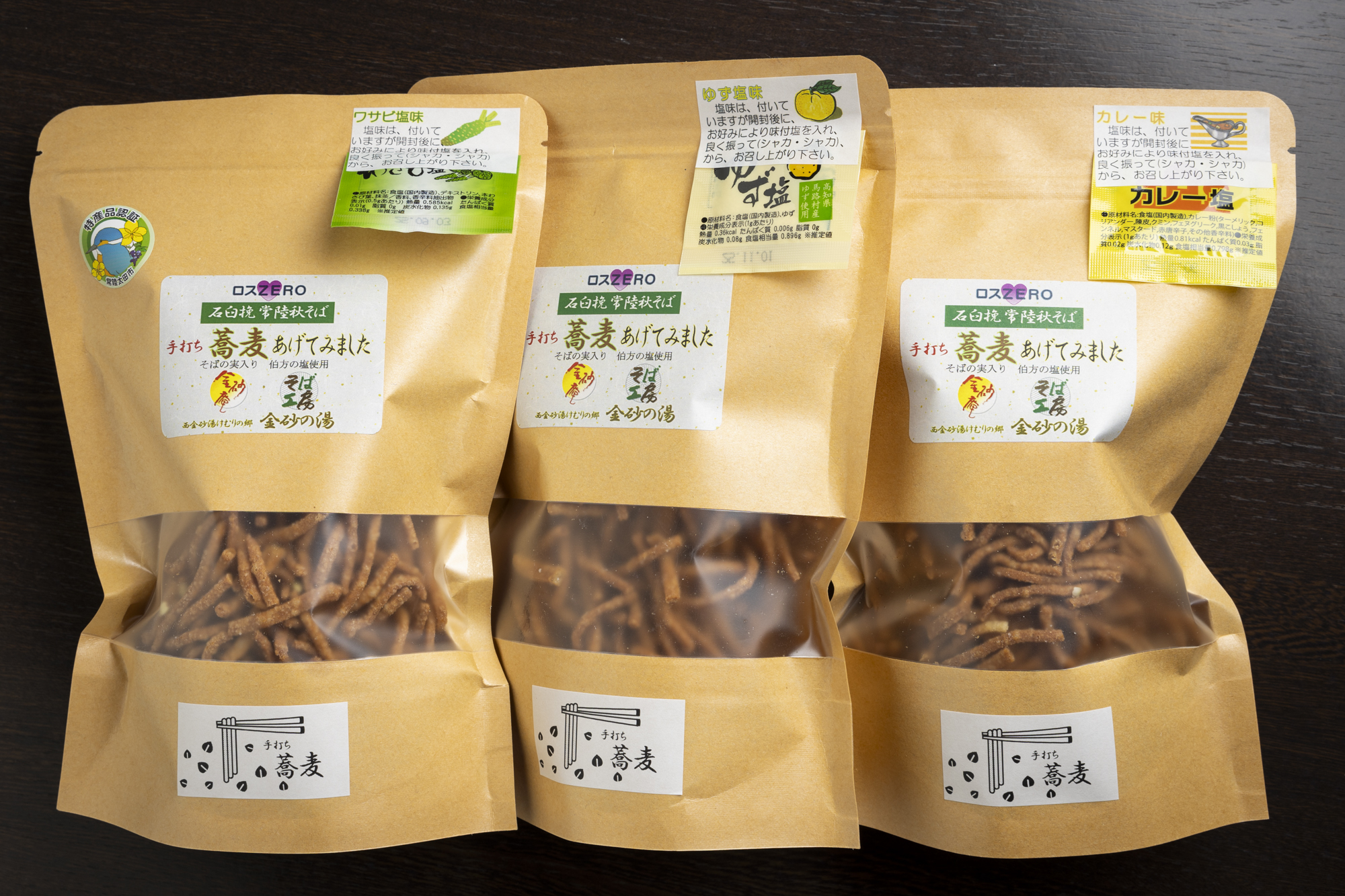 また、常陸太田のふるさと納税の返礼品にも選ばれているこの蕎麦を利用した「手打ち蕎麦あげてみました」も人気、味はワサビ、カレー、ゆず塩の3種類。酒飲みには絶対おすすめのお土産品、もう食べ始めたら止まりません。