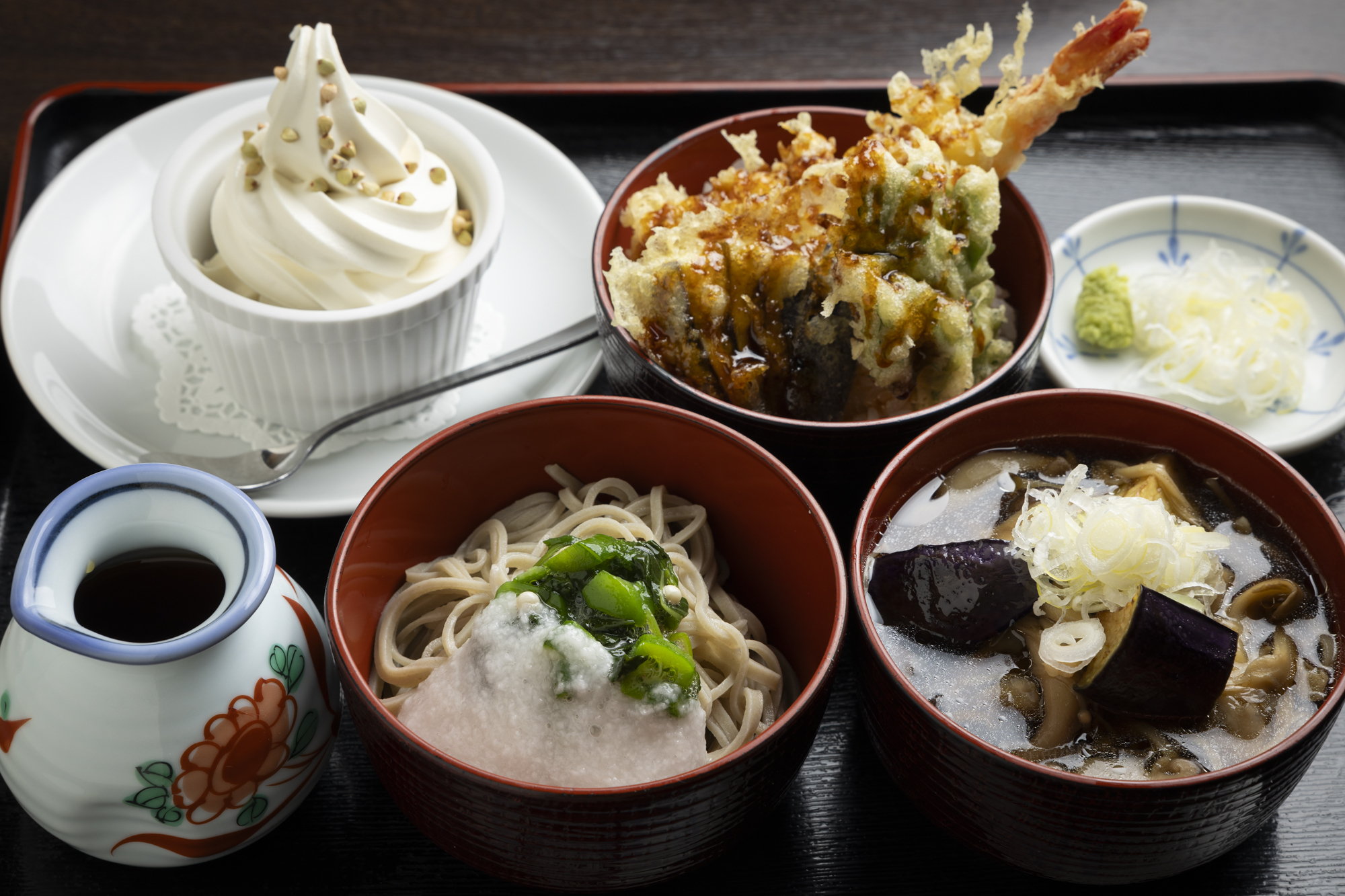 店自慢の一つは「三彩そば」、季節の蕎麦2種と地野菜を使ったミニ天丼、そしてそば茶ソフトクリームが付いてくる豪華なセット。夏は山菜蕎麦と辛味大根のぶっかけを、冬にはモロヘイヤと山芋のぶっかけに茄子ときのこの温かい蕎麦などが組み合わされます。地元農家の皆さんか収穫した野菜を中心にメニューを組み立てているので変更になることも。それも訪れた方々には季節の地の味を堪能できると人気です。