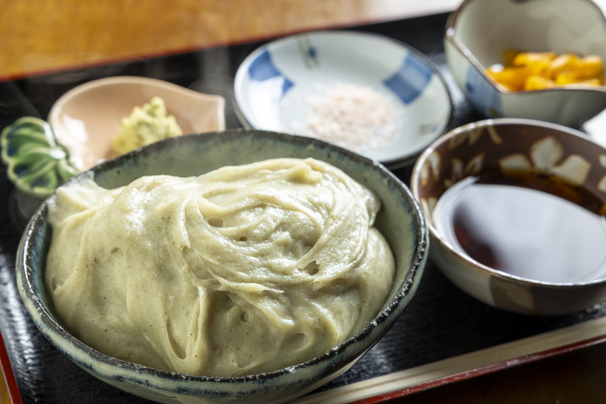 主の会沢二郎さんは脱サラ後、独学で蕎麦打ちをはじめました。その蕎麦打ちは基本に忠実でありながらも、既成概念にとらわれない探求心により、常に進化中。同店の蕎麦を食べたお客さんは口を揃えて「十割そばでこんなに滑らかなお蕎麦をはじめて食べた」と賞賛しています。その日打つ分だけ玄蕎麦を挽き、そして粉の粒を揃えてからしっかり練る。のしも切りも基本に忠実に!しかし、その工程の中で空気を抜く特別な作業をすることで、従来では考えられないような、しっかりとつながった手打ち蕎麦ができあがります。十割ならではの香りと旨味が秀でたそばでありながら、抜群のつながりで、喉を打つ食感もたまりません。