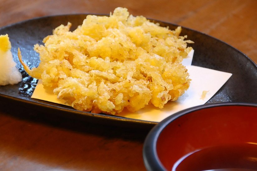 オススメのかき揚げは、イカと玉ねぎのみを使い、玉ねぎは地元美浦で採れたもの。