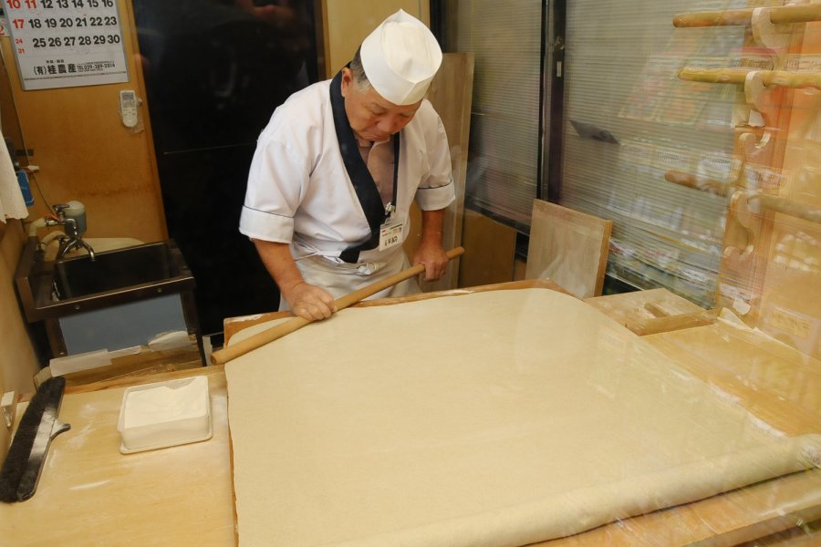 そば打ちの様子は、直売所入り口にて毎日見学できます。