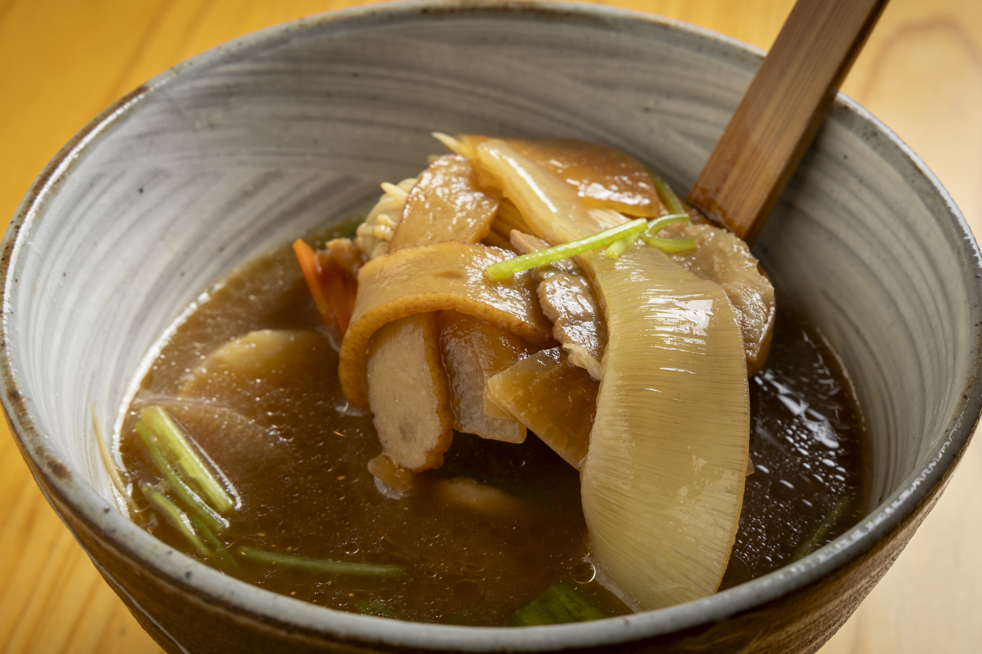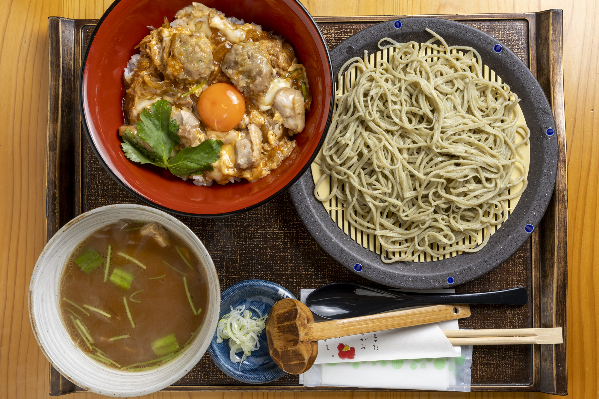 茨城のおいしさをギュッと詰め込んだ「満腹奥久慈しゃも膳」は、奥久慈しゃもの親子丼と水府庵自慢の多彩な4種類の付け汁が選べる贅沢なセット。その中でも「1番のセット」はふかひれ付けけんちん汁がセットになった贅を極めたひと品です。とろっと仕上がった親子丼の中にはしゃもの肉と大粒の肉団子。奥久慈しゃもの濃厚な卵黄がたまらない味わい。そこに茨城の郷土料理であるつけけんちんをセットに。屋号の通り、味のベースは常陸太田の醤油と味噌の合わせ。その味わいは極々上品であり穏やか。