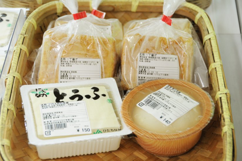 店内には豆腐の加工所が併設されおり、JA常陸管内で作られた大豆「ハタユタカ」を原料に豆腐が作られています。また、豆腐を購入したお客様におからの無料サービスをしております。土曜日と日曜日には、青大豆を使った青大豆豆腐も販売されます。